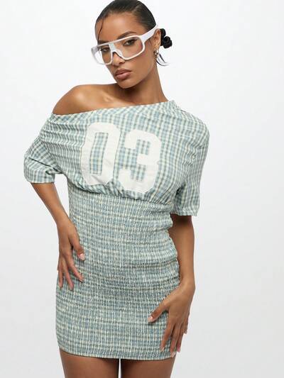 SUMWON WOMEN Mini-robe à carreaux , taille froncée, épaules dénudées, avec appliques et chiffres-50%