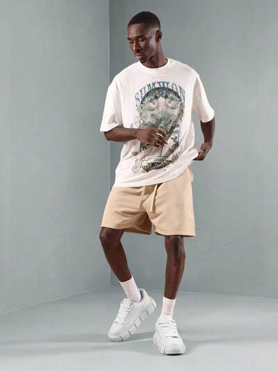 Ensemble coordonné décontracté beige avec chemise à manches courtes et shorts assortis, avec fermeture boutonnée devant et taille élastique. Tenue d'été décontractée en deux pièces
