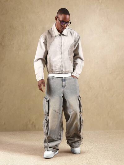 Jean large en denim délavé à l'acide avec braguette boutonnée