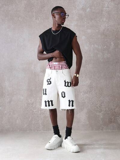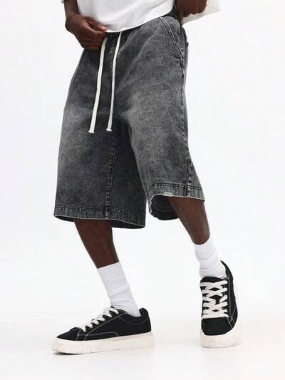 Short en jean bleu foncé Bermuda mi-long ample avec poches latérales, style décontracté d'été streetwear-45%