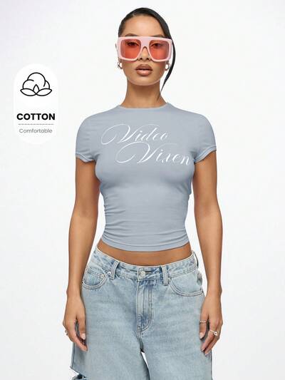 SUMWON WOMEN T-shirt court ajusté à manches courtes style années 2000BABYPHAT Top court zippé à capuche, manches courtes, col en V, imprimé script rose pâle, décontracté pour festival d'été