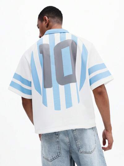 Polo rétro à imprimé numéro de football et patte de boutonnage-10%