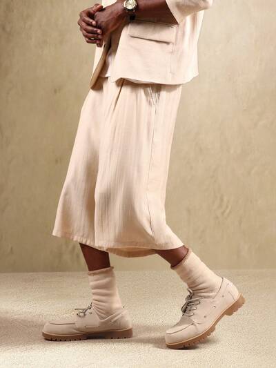 Short habillé plissé beige pour hommes avec coupe décontractée, parfait pour le port au bureau en été dans un style décontracté chic
