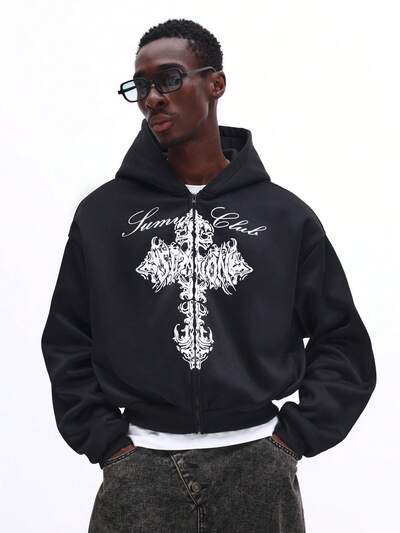Sweat à capuche zippé avec imprimé croix orné-30%