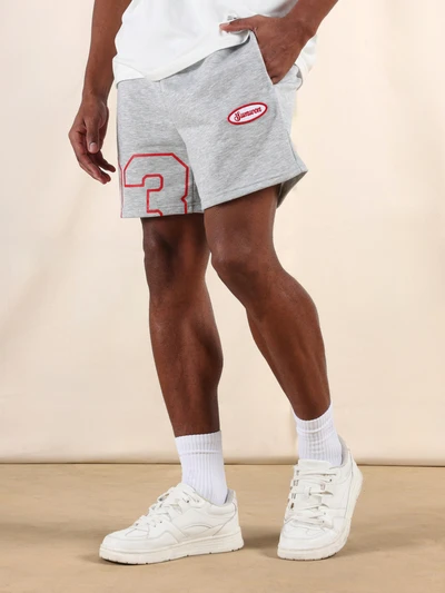 Short gris chiné à imprimé point d'interrogation et numéro, coupe regular, longueur au-dessus du genou, décontracté pour l'été, avec détail de taille marqué