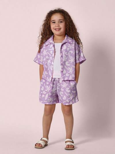 Ensemble deux pièces décontracté d'été pour filles avec haut court à manches courtes et shorts coordonnés de couleur lavande, avec imprimé emblème floral sur la poitrine