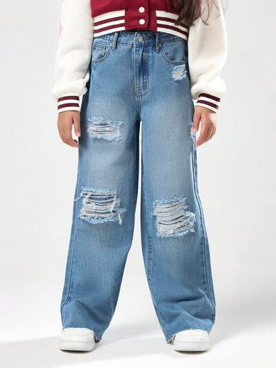 Jeans déchirés baggy pour filles adolescentes avec coupe ample et usée-50%