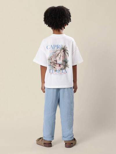 Ensemble coordonné d'été pour garçons avec t-shirt à manches courtes imprimé et pantalon de jogging à cordon de serrage. Tenue décontractée et confortable en deux pièces.Ensemble t-shirt et short imprimé Island