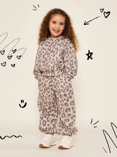 Ensemble 2 pièces de Sweat-shirt à col ras-du-cou léopard confortable pour tous les jours et pantalon de survêtement style 90 pour jeunes filles