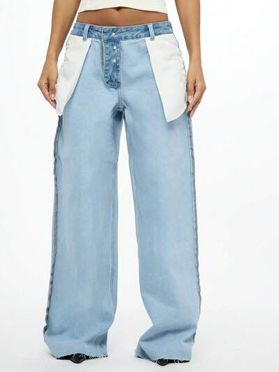 SUMWON WOMEN Jeans a gamba dritta con pannello bianco sovrapposto e orlo grezzo rovinato, modello Inside Out Design