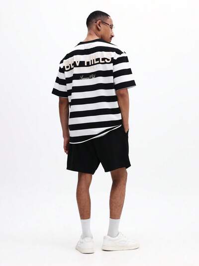 Set coordinato da uomo con maglietta a righe e pantaloncini, casual estivo, due pezzi, righe orizzontali, collo a giro, maniche corte, vestibilità regular, nero e bianco
