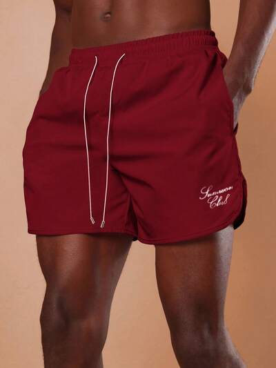 Pantaloncini da spiaggia da uomo color borgogna con laccetto, vestibilità regular, orlo curvo, costumi da bagno per vacanze estive-15%