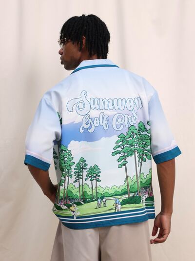 Camicia da uomo a maniche corte, con colletto alla coreana, stampa da campo da golf, stile vacanziero, adatta per l'estate-35%