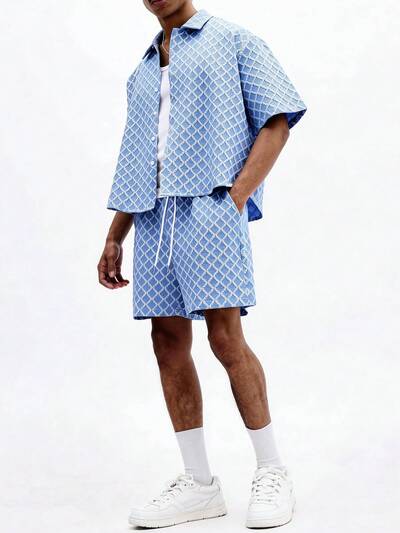 Completo giacca e pantaloncini in nylon con colletto abbottonatoCompleto estivo casual da uomo con polo a collo blu crema con stampa di testo e pantaloncini con vita elastica coordinati