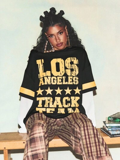 SUMWON WOMEN Maglietta universitaria a doppio strato con grafica a stella e design numerico-35%
