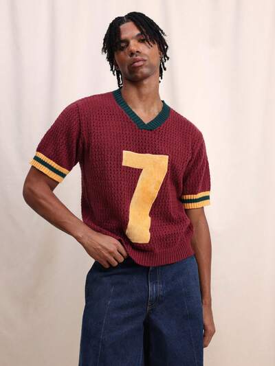 Maglietta ampia da uomo a maniche corte con scollo a V in maglia all'uncinetto, colore bordeaux, con stampa del numero sette e dettagli a righe sul bordo