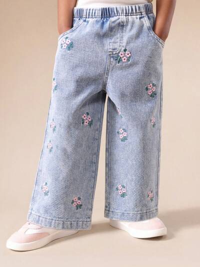 Jeans in denim a vita alta con gamba larga e orlo risvoltatoJeans a gamba larga con ricamo a farfalla e dettagli a fiocco