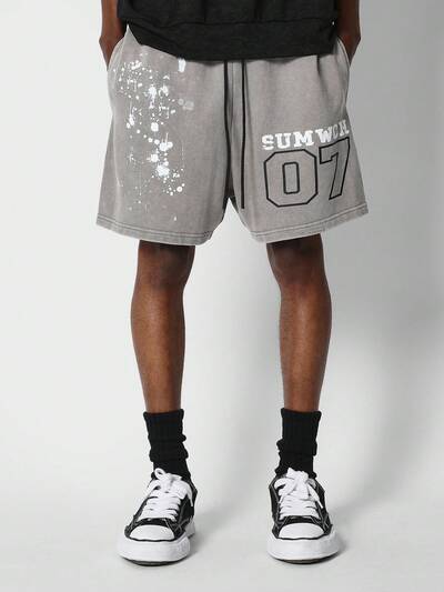 Pantaloncini a gamba larga con stampa a spruzzo di vernice e grafica con numero