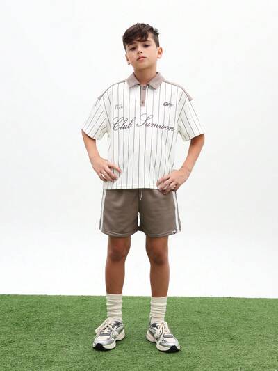 オーバーサイズレタープリントTシャツとジョガーパンツのセットティーンボーイ 縦縞ポロシャツ&ショーツ 2点セット コントラストカラー クラブロゴ カジュアル サマーアウトフィット ワールドカップ