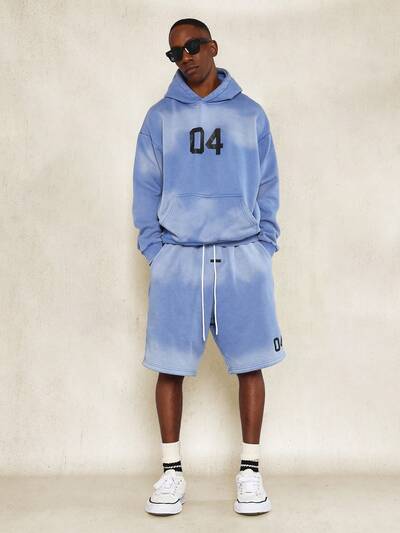 カンガルーポケット付きウォッシュ加工パーカーとナンバープリントショートパンツ 2点セット-40%
