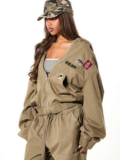 SUMWON WOMEN オーバーサイズ フード付き デニム ミリタリー ジャケット パッチ付き-25%