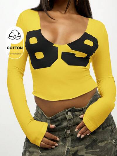 SUMWON WOMEN Vネックの長袖グラフィッククロップトップ-10%