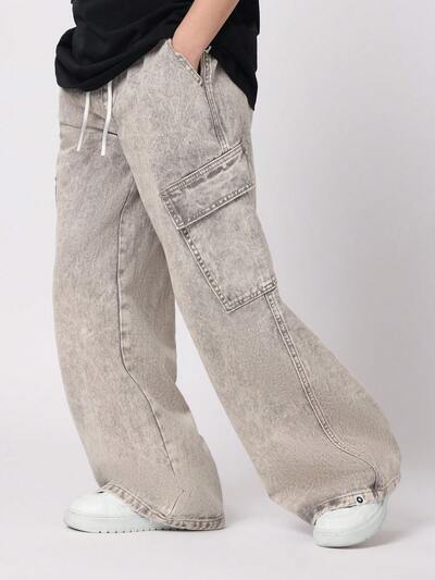 斜めのカーゴポケット付きワイドレッグデニムジーンズ