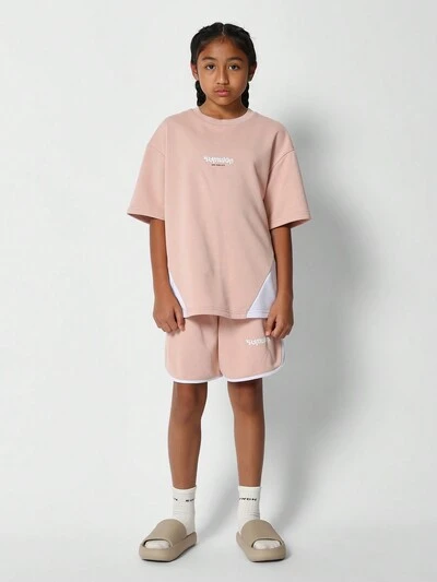キッズ ユニセックス カラーに分かれたTシャツとショートパンツ 2点セット オーバーサイズフィット-50%