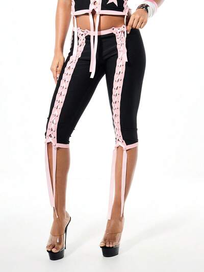 SUMWON WOMEN スリンキーコントラストバインディングスターアップリケレースアップカプリレギンス、ピンクのディテールトリミング、ファッションステートメントピースSUMWON WOMEN ラインストーンディテールのカモフラージュキュロットショーツ
