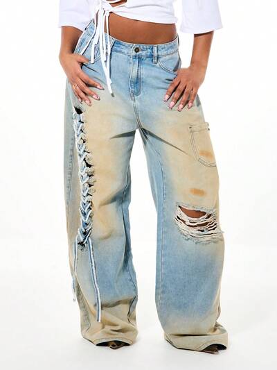 SUMWON WOMEN ダメージ加工のディテールが施されたレースアップフレアデニムジーンズ
