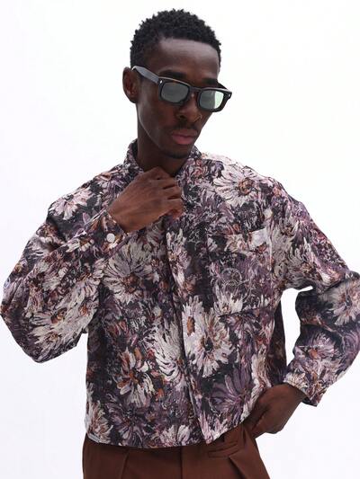 スプレッドカラーのクロップド丈タペストリープリントオーバーシャツ-35%