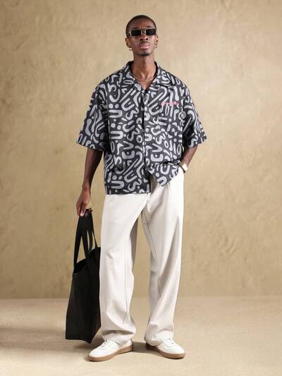 カジュアルなボックスフィットグラフィックプリント半袖ボタンダウンシャツ