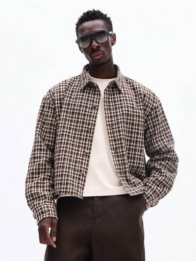 テクスチャードハウンドトゥース長袖ボタンシャツ-10%