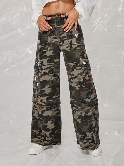 SUMWON WOMEN パンク ワイドレッグ カーゴ ユーティリティー カモフラージュ パンツ、取り外し可能な脚ジップ、スプラッター ペイント-50%
