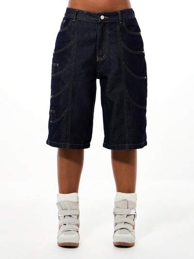 SUMWON WOMEN ドローストリング付きハイウエストロング丈デニムショートパンツBABYPHAT ストレッチデニムショーツ、ホワイトのトップステッチ、ハイライズ、フィッティングジーンズスタイル、夏カジュアル レディース