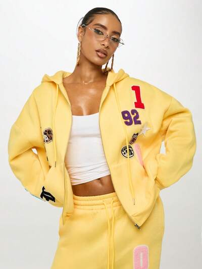 SUMWON WOMEN レタープリントのオーバーサイズジップパーカーBABYPHAT 長袖 ベロア フルジップ トラックジャケット、刺繍ロゴ付き、カジュアル冬用