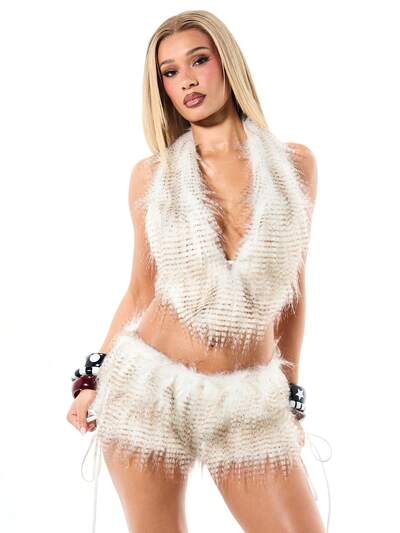 SUMWON WOMEN 홀터넥 인조 모피 프린지 크롭탑