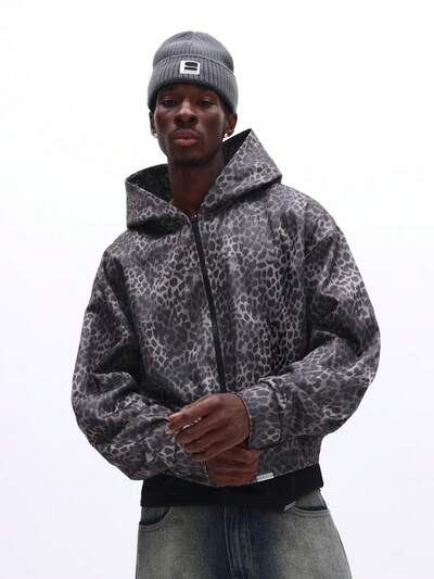 끈이 달린 레오파드 프린트 지퍼 후드 티셔츠-45%