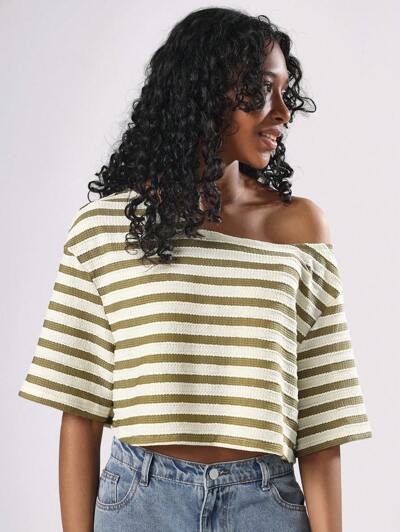 넓은 소매가 있는 스트라이프 오프숄더 리브 크롭 탑-50%