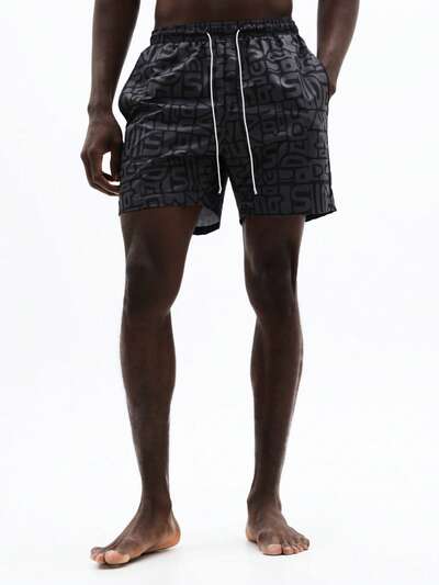 PLAYBOY X SUMWON 남성용 토끼 로고 프린트 드로스트링 수영 트렁크 여름 해변 수영 반바지 신축성 허리 밴드 캐주얼 수영복곡선형 밑단이 특징인 추상적인 프린트 수영 반바지