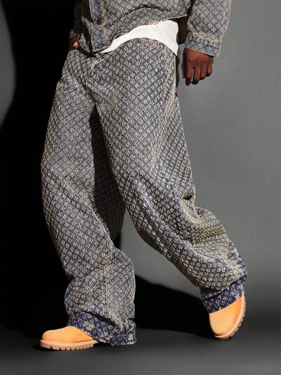 와이드 레그 배기 모노그램 패턴 데님 진새로움