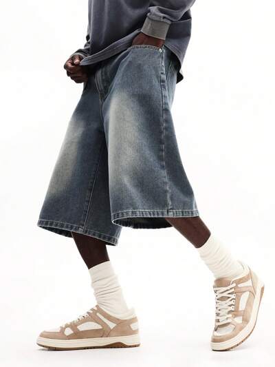 빈티지 워싱 처리된 와이드 레그 배기 데님 반바지
