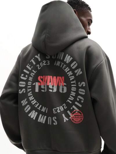 원형 텍스트 프린트가 있는 오버사이즈 후드 티셔츠센터 포켓이 있는 엠보싱 로고 풀오버 후드 티셔츠