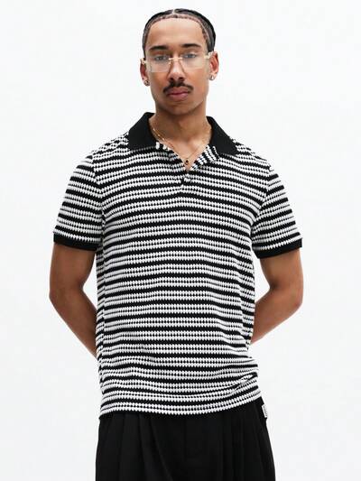 버튼 여밈이 있는 스트라이프 니트 폴로 셔츠-15%