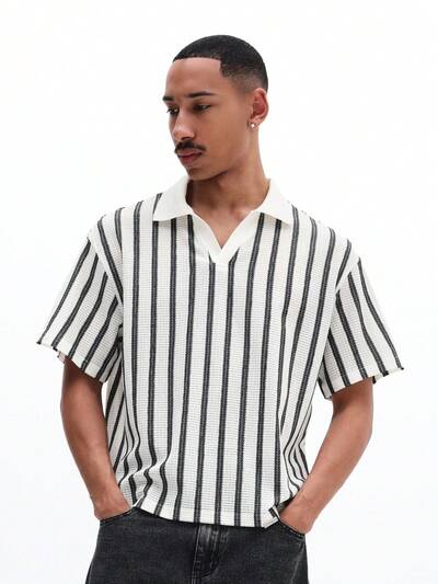 남성용 박시 폴로 셔츠, 가로 스트라이프 V넥 반팔 캐주얼 여름 상의, 로고 디테일새로움