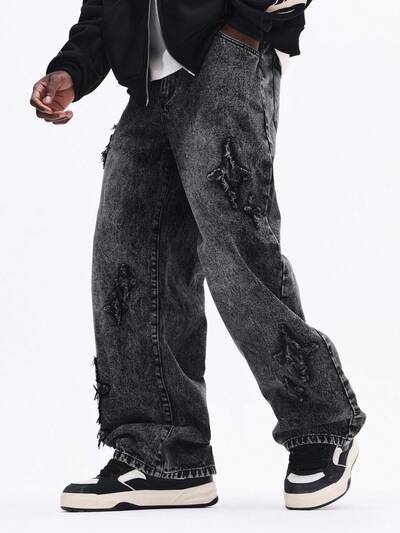스타 패턴 디스트레싱 와이드 레그 데님 진