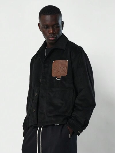 독특한 브라운 가죽 패치가 돋보이는 스웨이드 유틸리티 재킷-50%
