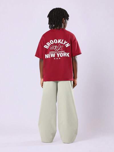 스타일리시한 반팔 캐주얼 트윈 남아용 티셔츠와이드 레그 트랙 팬츠와 함께 입는 바시티 넘버 티셔츠