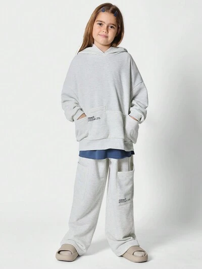 트윈 걸 오버사이즈 후드 상의와 수수한 자수 및 작은 훼손된 디테일이 있는 루즈 핏 조거 팬츠 2피스 세트-50%