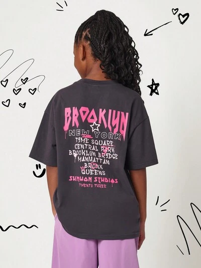 트윈 트윈걸 캐주얼 레터 그래픽 드롭 숄더 오버사이즈 티셔츠 - 여름용-50%